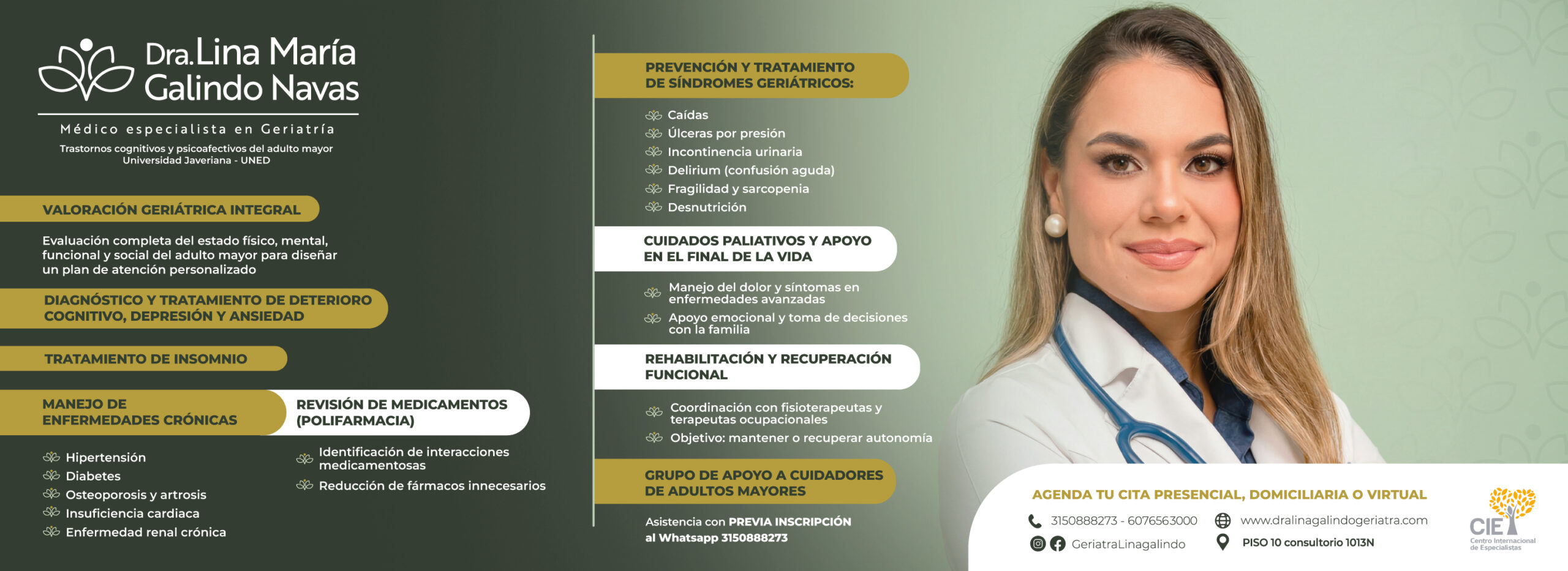 Médica especialista en geriatría de la Universidad Javeriana. Cuento con una experiencia profesional de más de 10 años donde me he caracterizado por ser una profesional humana, empática, académica y con actuar ético que me ha permitido crear una excelente relación médico - paciente y familia y crecer profesionalmente. Me considero con vocación plena hacia el acompañamiento integral, ético y comprensivo de las personas mayores, sus familias, cuidadores y entornos significativos, reconociendo siempre sus particularidades, trayectorias y necesidades. Estoy convencida que el verdadero arte de la medicina no está solo en el conocimiento técnico, sino también en la presencia, el respeto por los tiempos del otro, la escucha genuina y la convicción de que siempre hay algo por hacer. Mis servicios son: ° Valoración Geriátrica Integral Evaluación completa del estado físico, mental, funcional y social del adulto mayor para diseñar un plan de atención personalizado. ° Diagnóstico y tratamiento de Deterioro cognitivo, depresión y ansiedad. ° Tratamiento de Insomnio ° Manejo de Enfermedades Crónicas Tratamiento y seguimiento de condiciones comunes en la vejez: Hipertensión Diabetes Osteoporosis y Artrosis Insuficiencia cardíaca Enfermedad renal crónica ° Prevención y Tratamiento de Síndromes Geriátricos: Caídas Úlceras por Presión Incontinencia urinaria Delirium (confusión aguda) Fragilidad y Sarcopenia Desnutrición Sarcopenia ° Revisión de Medicamentos (Polifarmacia) Identificación de interacciones medicamentosas Reducción de fármacos innecesarios ° Cuidados Paliativos y Apoyo en el Final de la Vida Manejo del dolor y síntomas en enfermedades avanzadas Apoyo emocional y toma de decisiones con la familia. ° Asesoramiento a Familiares y Cuidadores -Orientación sobre el cuidado diario -Herramientas para el manejo del estrés y la sobrecarga del cuidador - Grupo de apoyo a cuidadores de adultos mayores - Dos sesiones cada semana. Asistencia con previa inscripción al Whatsapp 3150888273. Rehabilitación y recuperación funcional Coordinación con fisioterapeutas y terapeutas ocupacionales. Objetivo: mantener o recuperar autonomía