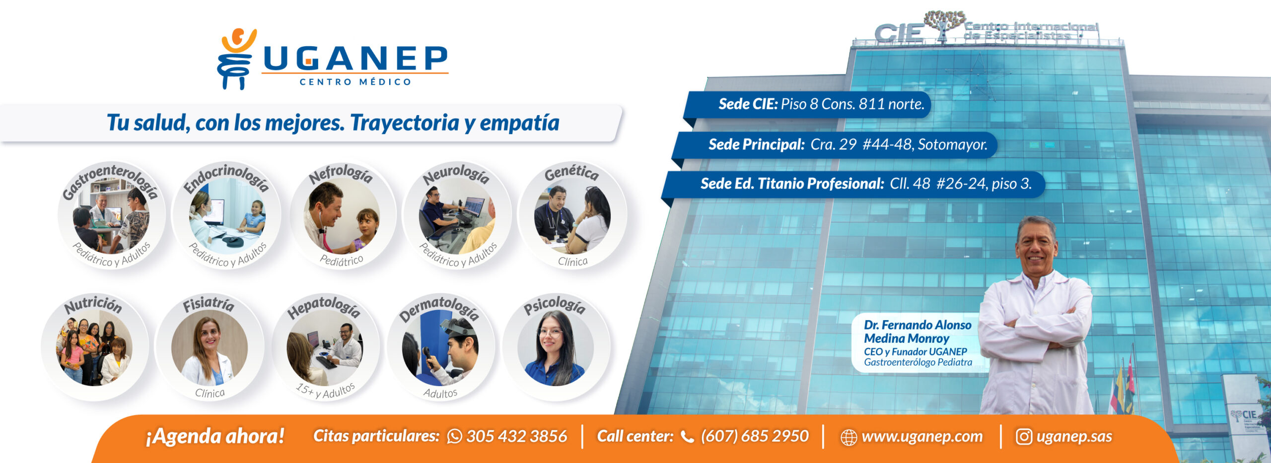 En el Centro Médico UGANEP SAS, ofrecemos un amplio portafolio de servicios médicos especializados. Con 20 años de trayectoria y pioneros en Gastroenterología Pediátrica y Adultos en la región, le apostamos a fusionar la pericia de nuestros médicos especialistas con tecnología de vanguardia para asegurar diagnósticos precisos y la pronta recuperación de los pacientes. Estamos comprometidos con brindar una atención médica integral, centrada en la persona, con la calidez y empatía necesaria para aportar al bienestar de los usuarios. Contamos con expertos en Gastroenterología (pediátrica y adultos), Endocrinología (pediátrica y adultos), Hepatología (15+ y adultos), Nefrología (pediátrica), Neurología (pediátrica y adultos), Genética clínica, Fisiatría, Nutrición, Dermatología, Psicología y más. Realizarse exámenes y procedimientos diagnósticos es clave para evitar enfermedades como el cáncer gástrico. Tu salud, con los mejores. Cuídate, tu salud no espera.